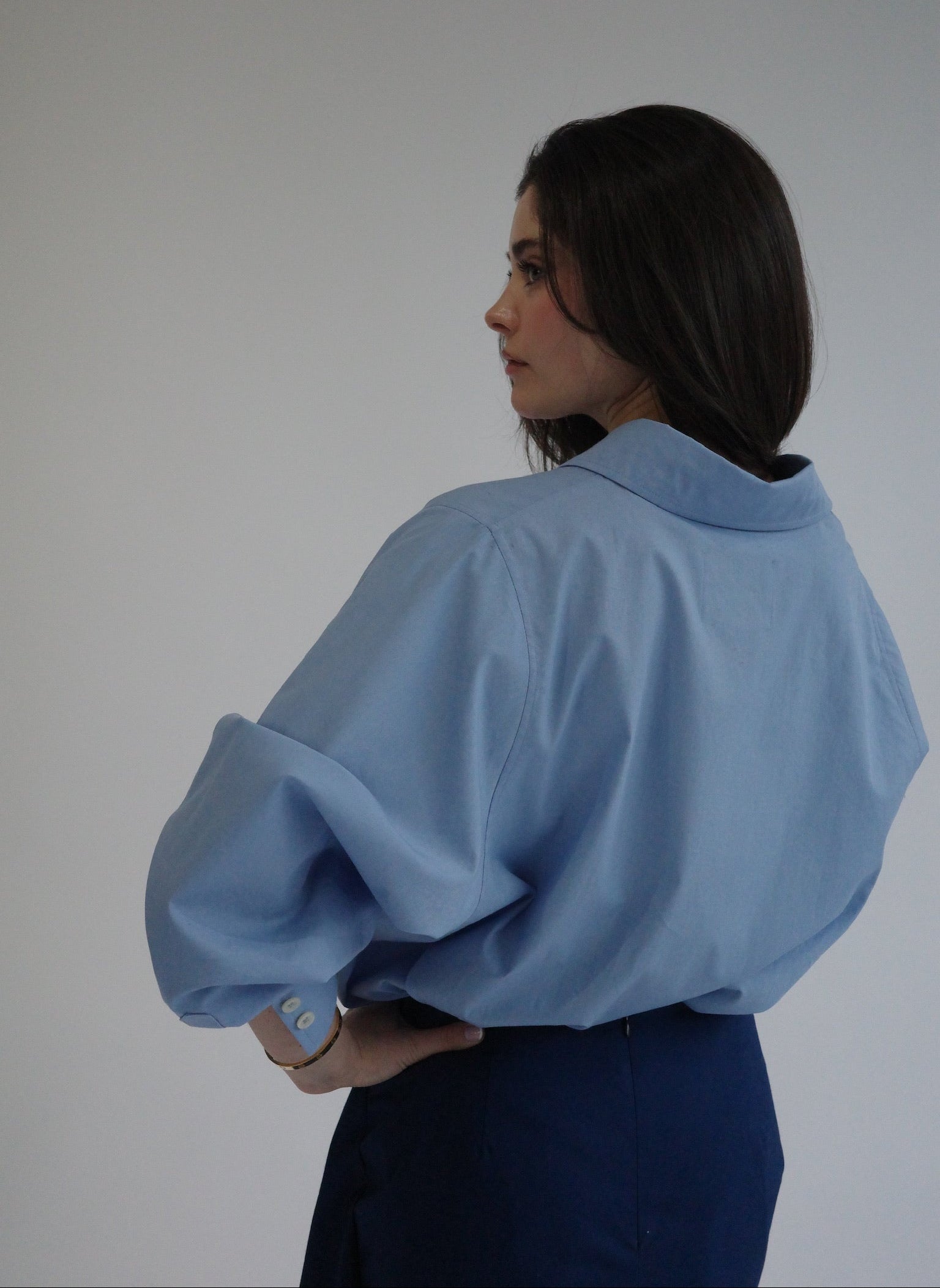 A structured yet relaxed interpretation of the classic button-down. Defined by a dropped shoulder, voluminous sleeves with elongated cuffs, and a hidden button placket for a clean, modern finish. Designed with an intentionally oversized fit.